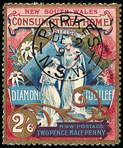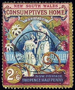 The 2½d multi-coloured stamp was issued to pay the cost of a basic letter sent overseas. On 26th June 1897 NSW Government Gazette described the design of the 2½d (2/6) stamp as follows: "The motive of 'restoration' or 'rebuilding' is typified by two figures draped in white, the strong gently leading the weak, while she points to the motto "Redifico'. This vignette is placed in a diamond frame, above which are the words 'Consumptives Home' inscribed on a riband. A circle of gold forms the background, upon which the flannel flower and waratah are displayed. In the left lower corner is a medallion bearing the figures 2/6, while the base of the design is inscribed 'N.S.W. Postage, Twopence Halfpenny". This stamp is printed in gold, blue, rose and carmine". The Charity stamp was sold for 12 times the face value to raise money for the Consumptives Home Fund.