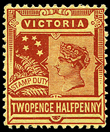 ![]() 2½d (2/6) brown Queen Victoria with CTO Melbourne date stamp of 22 October 1897 - First Day of Issue. |