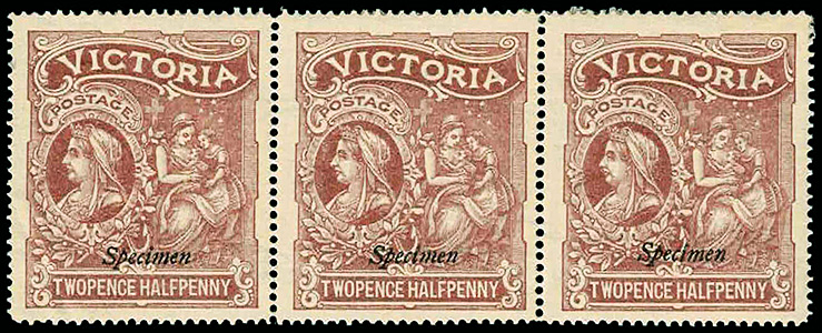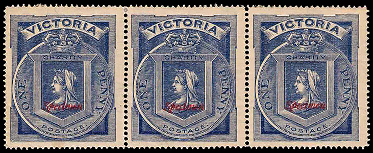 Both of the 1897 Victorian Hospital Fund Charity stamps were overprinted Specimen in italic serif font - 12 mm wide (type 22). The 1d (1/-) stamp was overprinted in red while the 2½d (2/6) was overprinted in black. This overprint was only used on the Victorian Charity stamps intended for distribution to members of the newly created U.P.U.